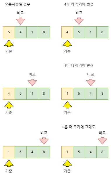 배열의 첫 번째 값을 기준으로 그 다음 값 부터 마지막까지를 비교하며,