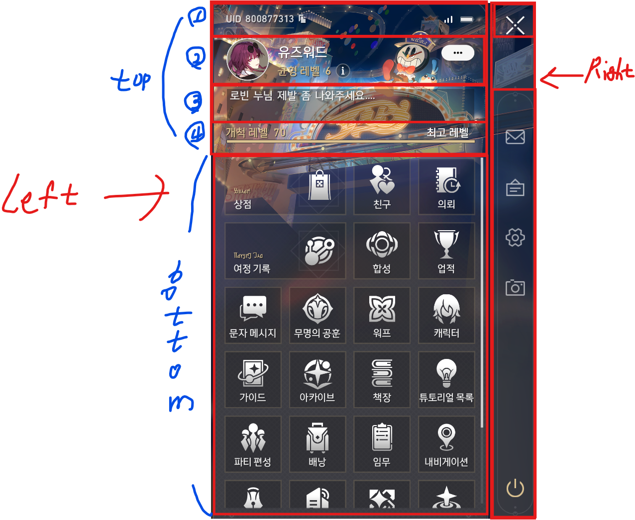 본격적으로 붕괴 스타레일 메인 화면의 UI에 대해서 분석해보겠습니다.