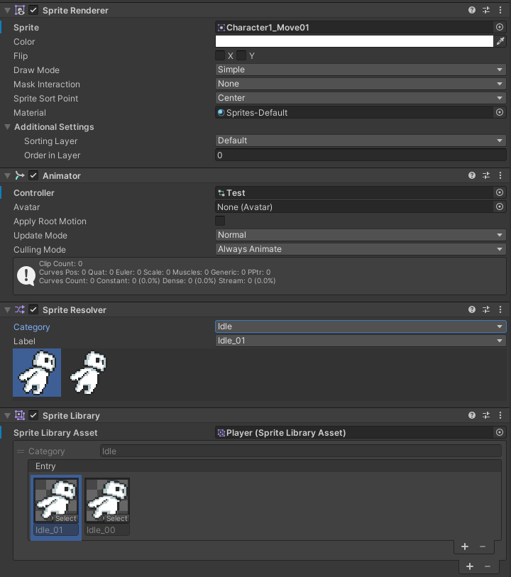 SpriteRender와 Animator, SpriteResolver, Sprite Library 컴포넌트를 부착해줍니다.