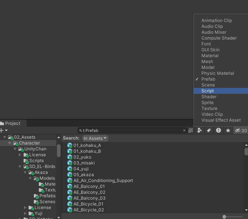그 중에서 Prefab이 있습니다. 이를 눌러보면, 현재 소지하고 있는 Prefab 파일이 나옵니다. 이 때 검색창을 자세히 보면 `t:Prefab`이라고 적혀있습니다. 여기서 t는 Type이며 Prefab은 그 타입 중 하나 입니다.