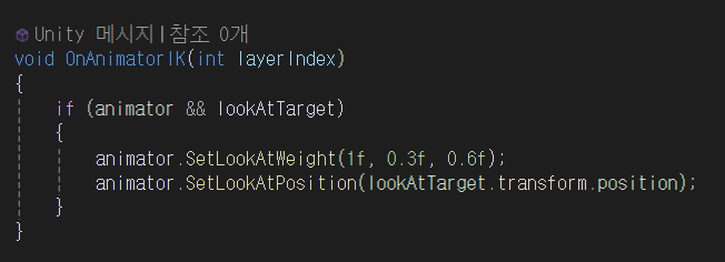 하지만 Unity에서는 각 부위 별로 가중치를 주고 transform.LookAt()과 같은 기능을 Animator에서 제공해줍니다.